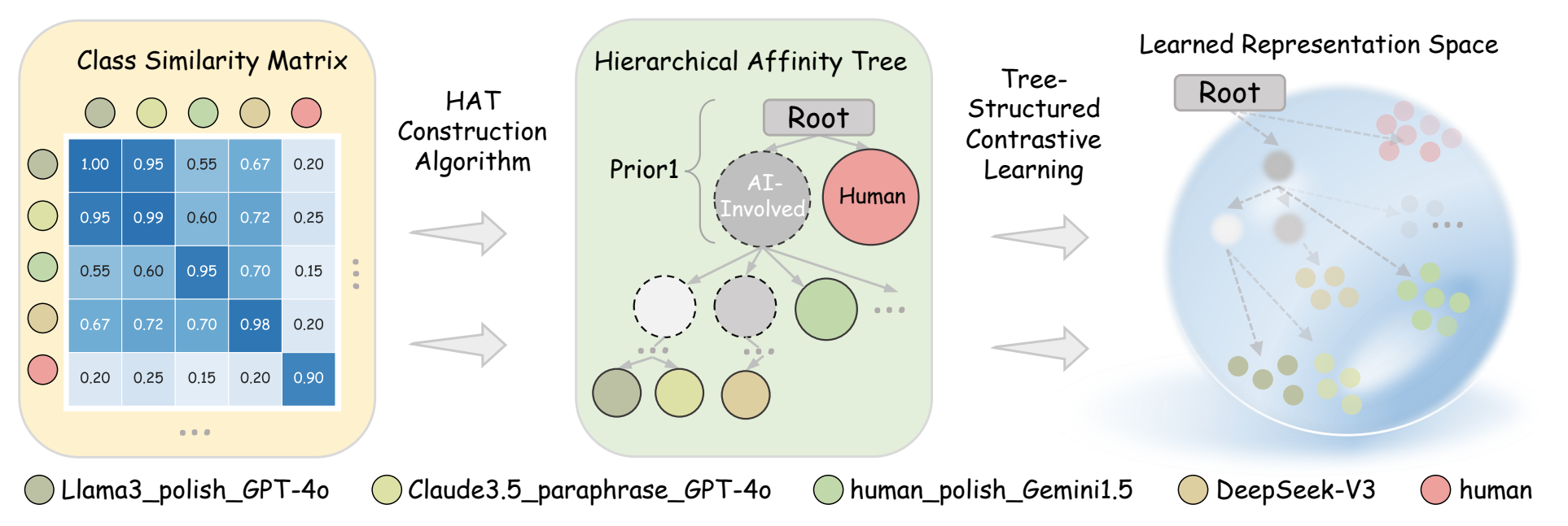 Abstract:Detecting AI-involved text is essential for combating misinformation, plagiarism, and academic misconduct. However, AI text generation includes diverse collaborative processes (AI-written text edited by humans, human-written text edited by AI, and AI-generated text refined by other AI), where various or even new LLMs could be involved. Texts generated through these varied processes exhibit complex characteristics, presenting significant challenges for detection. Current methods model these processes rather crudely, primarily employing binary classification (purely human vs. AI-involved) or multi-classification (treating human-AI collaboration as a new class). We observe that representations of texts generated through different processes exhibit inherent clustering relationships. So, we propose DETree, a novel approach that models the relationships among different processes as a Hierarchical Affinity Tree structure, and introduces a specialized loss function that aligns representations to this tree. To facilitate this learning, we developed RealBench, a comprehensive benchmark dataset that automatically incorporates a wide spectrum of hybrid texts produced through various human-AI collaboration processes. Our method improves performance in hybrid text detection tasks and significantly enhances robustness and generalization in out-of-distribution scenarios, particularly in few-shot learning conditions, further demonstrating the promise of training-based approaches in OOD settings.